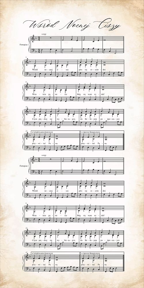 Wprowadź magiczny, świąteczny klimat do swojej przestrzeni dzięki wyjątkowemu wydrukowi wielkoformatowemu na płótnie z nutami kolędy „Wśród Nocnej Ciszy”.